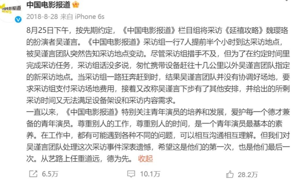 最引发争议的,莫过于当年《中国电影报道》的采访事件。媒体团队提前准备齐全设备,顶着沉重器材准时抵达指定地点,却突遭吴谨言方临时更改拍摄场地的通知。